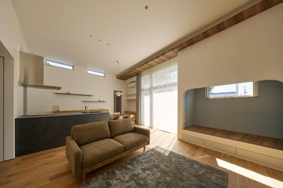 リビングの一角は階段下を利用したヌックになっています。読書やお昼寝といった「一人時間」を過ごしたり、お子さんのプレイスペースにしたりと、同じ空間で家族と過ごしつつも、ちょっとした「おこもり」が叶います。