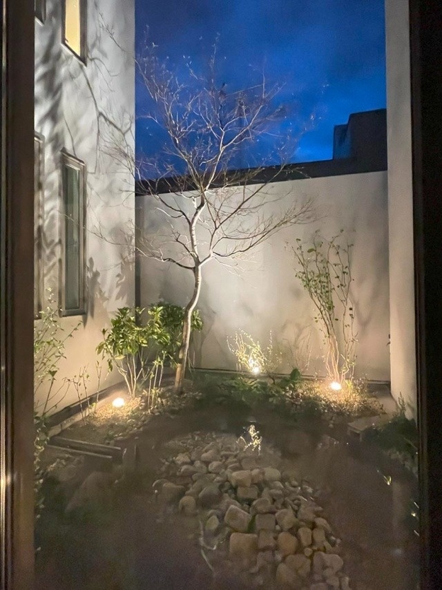 帯広市の工務店YOTUMOKU-side(ヨツモクサイド)が手掛けた、こちらの平屋住宅には、「気持ちのよい自然光や四季の移ろいを感じられるように」という吉田社長の発案で、玄関脇に坪庭をつくりました。夜間にはアオハダの木がライトアップされ美しい陰影が楽しめる、オーナーさんお気に入りのポイントです。