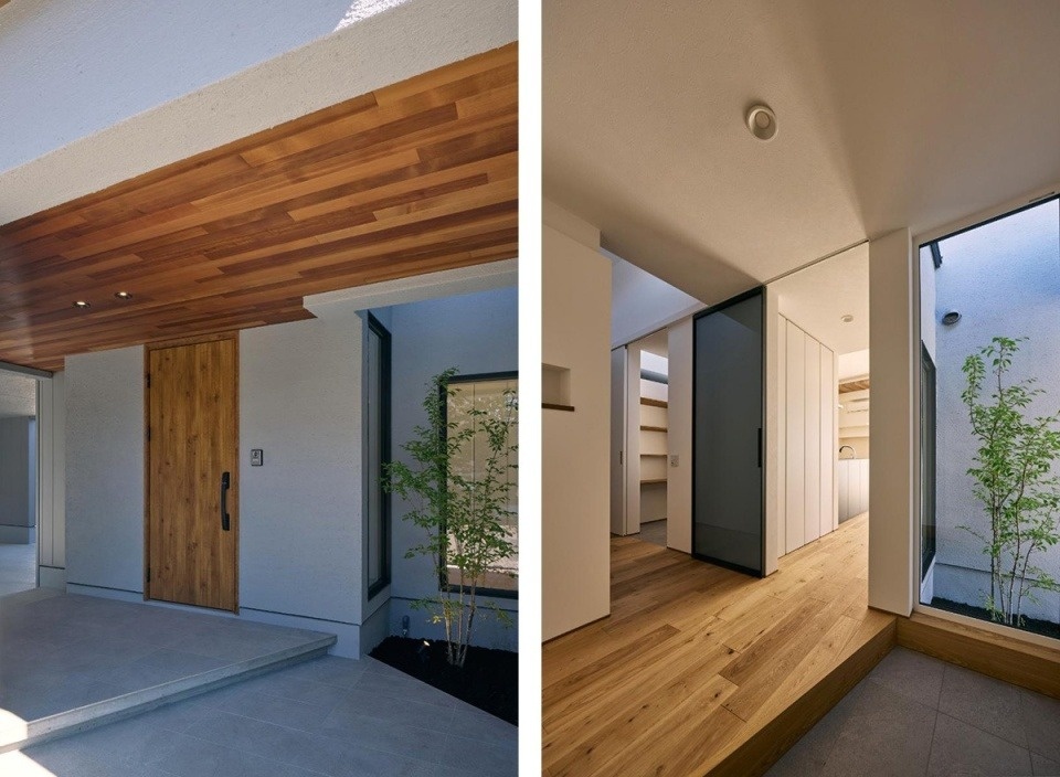 玄関を入ると正面には中庭。室内の日当たりや風通しを良くするには大きな窓を設けるという選択肢もありますが、それは同時に防犯上、そしてプライバシー確保という意味ではマイナスに作用することもあります。中庭なら、そういう面をあまり心配せず屋外の光や風を取り込むことができます。