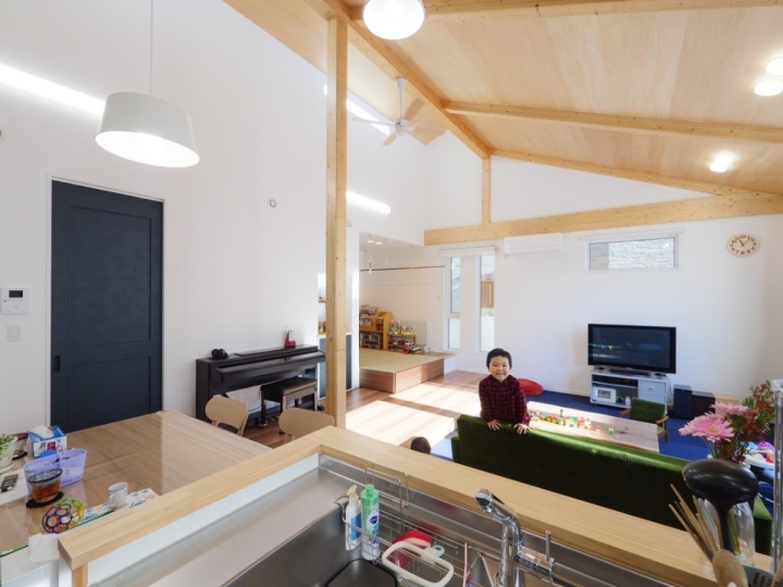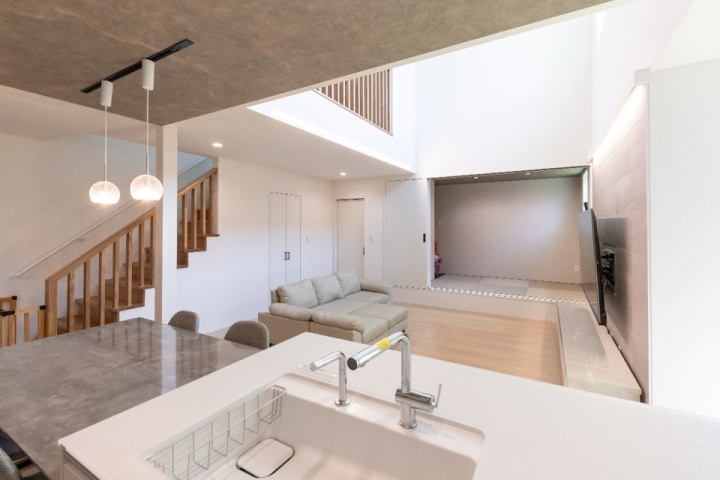 吹き抜けのLDKと一体化した小上がり空間を、フレキシブルに活用しています。