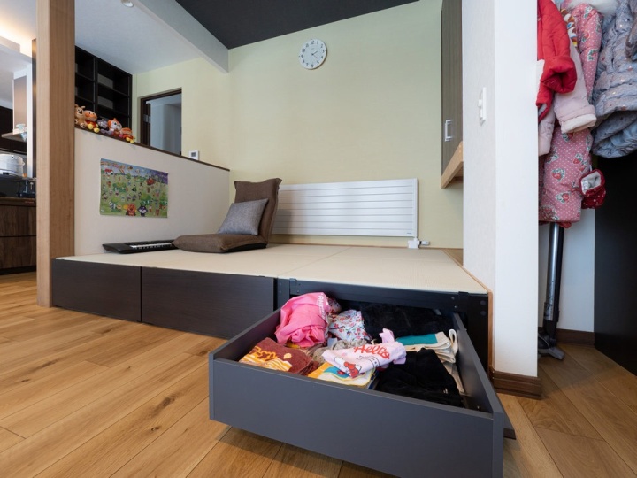 小上がりの下は石井さんの提案による引き出し式の収納があり、お子さんの衣類など、すぐ取り出したいアイテムを収納するのに重宝しています。収納力の高さは予想以上です。