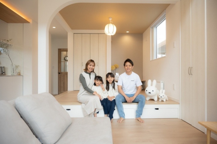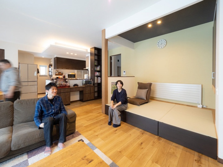 リビング横には将来的に仏壇を置くための和室をつくりました。小上がりになっているので腰掛けてテレビを見たり、子供たちが寝転がって遊んだりと重宝しているそう。