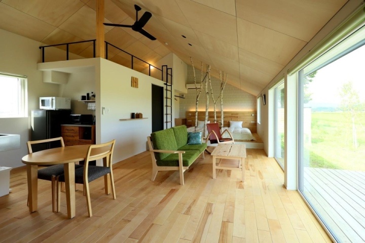 ロフトからの眺め。シンボルのシラカバはアーケン・藤原さんと一緒に森に行き選定しました。自然のなかで眠るような心地を味わえるベッド。大阪から遊びに来たご友人も「久しぶりにぐっすり眠れました」と絶賛です。