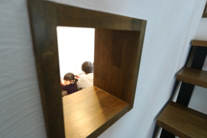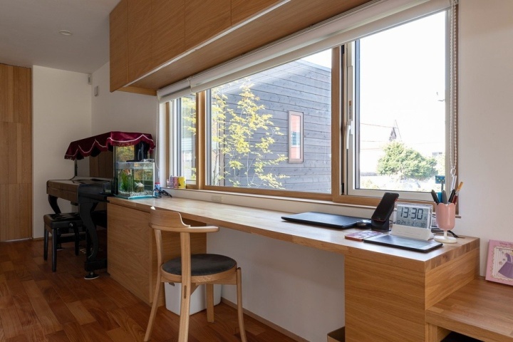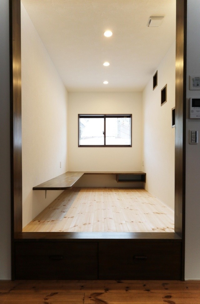 2階には子ども部屋もありますが、子どもたちが勉強したり、遊んだりできる個室も別途用意しました。小さな空間ですが、造作の机もセット。キッチンとの間の壁には小窓も。「子どもたちが部屋に籠もるより、家族と過ごす時間が増えると良いなと思って作りました」と奥さま。