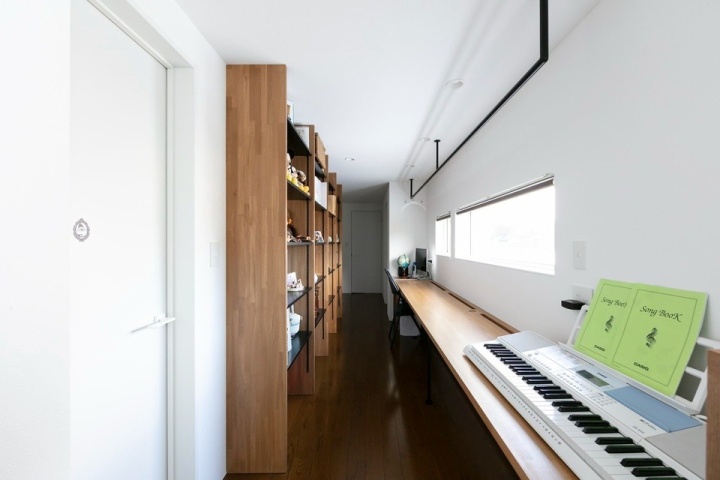 ピアノスペースの上は、階段の踊り場を活用した書斎があります。コンパクトなスペースに高い天井を生かし、はしご付きの大きな書棚を造作しています。