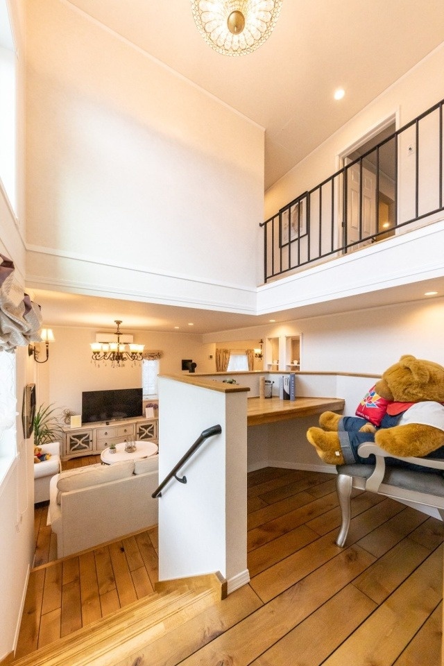 書斎を出ると、吹き抜けに面したフリースペースがあります。お子さんたちが就学したら、スタディスペースとして使う予定です。