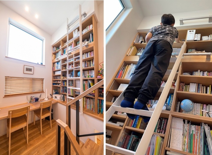 キッチンからも気配が分かる程よい距離感がよく、はしごが付いているので子どもたちも自分で本を出し入れできて、家族で重宝しています。