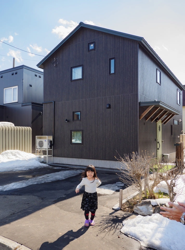 濃色のガルバリウム鋼板と道南杉との張り分けが落ち着いた個性を醸している3階建てのY邸。30代のご夫妻と、父親がお住まいの2世帯住宅です。