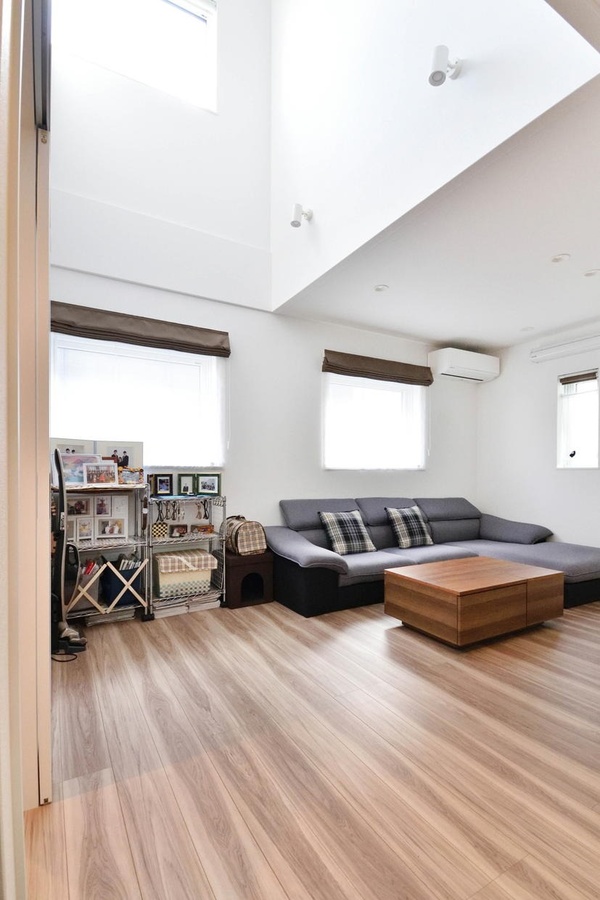 奥さん 近隣のお家とも距離が近いため、お互いの視線をさえぎりながら日中でも明るさがある家が良いと話していました。なるべくコンパクトにしながら開放的で広さを感じられる住空間が理想でした。高い天井によって上方向に視線の広がりがあることで、実際の坪数以上の広さを感じると訪れる方々も驚くそうです。