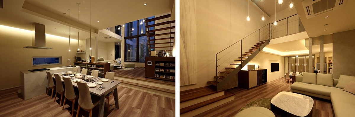 ヴィラの中に入るとすぐにダイニング・キッチンが、その先にスキップフロアの吹き抜けリビングが続いており、中庭に面した大開口から視線が抜け、縦横に広がりを感じさせる設計です。