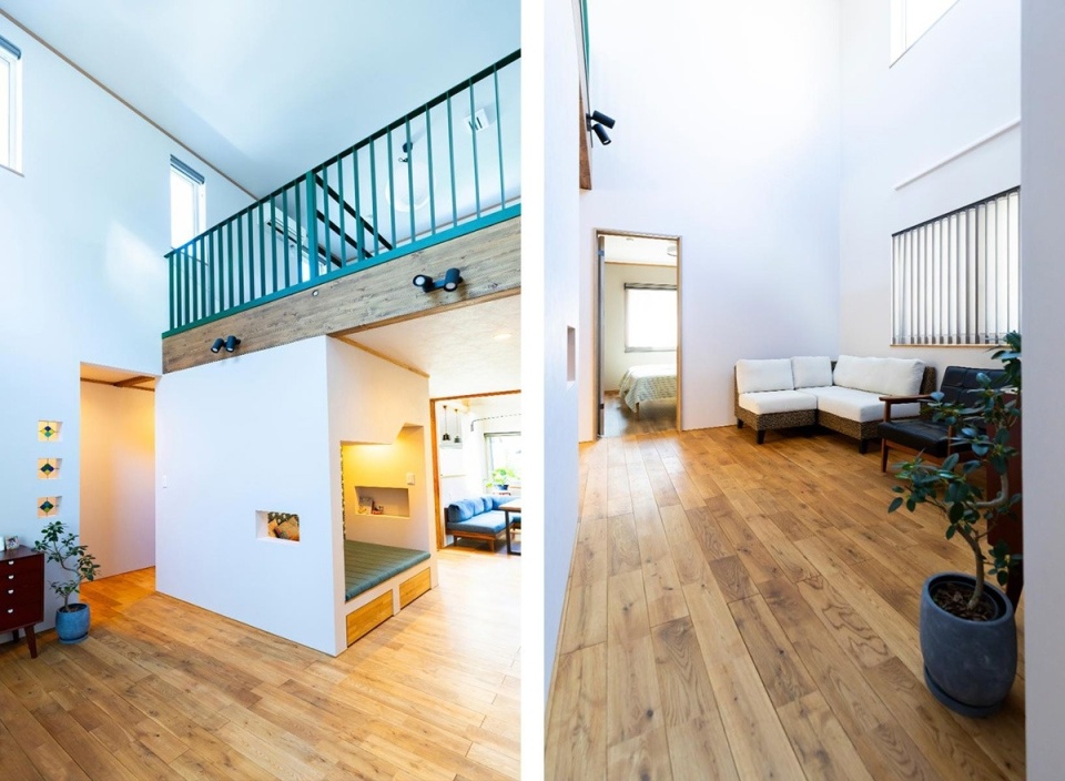 LDKは約19帖。構造梁を2本渡した大きな吹抜け構造です。床はナラの無垢フローリング、壁は塗り壁と、内装はキクザワらしい自然素材による仕上げです。画像右はフリースペースからの眺め。大きな吹抜け窓が外の景色や光を採り込むこの家のビューポイントです。