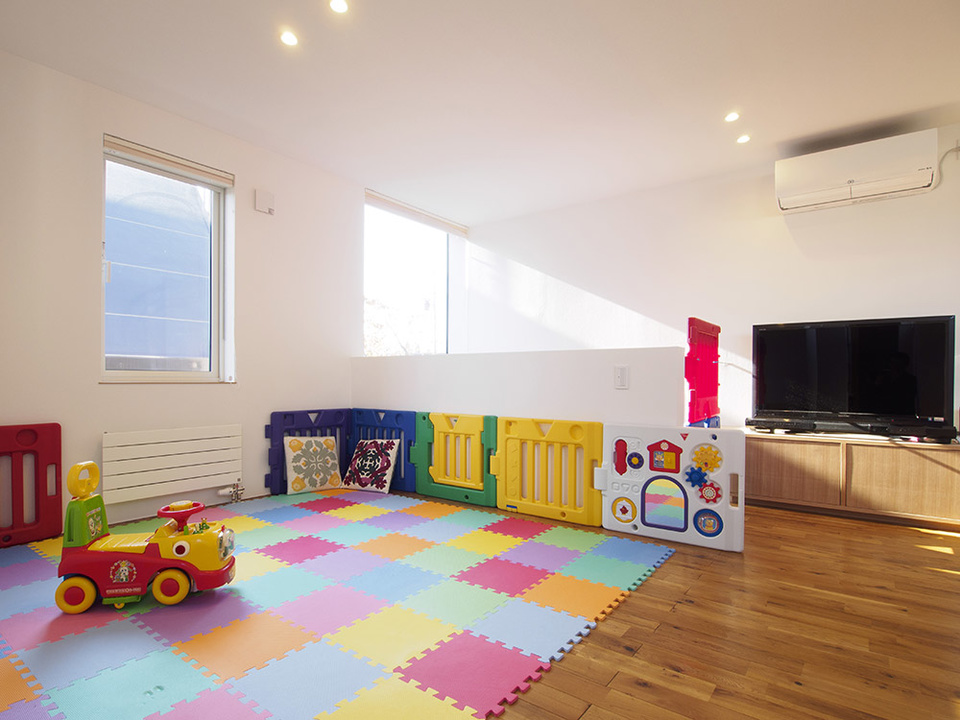 小さなお子さんの場合、プレイスペースはママの視線が届く範囲が理想ですね。成長とともに家族共有のワークスペースにするなど、様々な使い方が出来そうです。