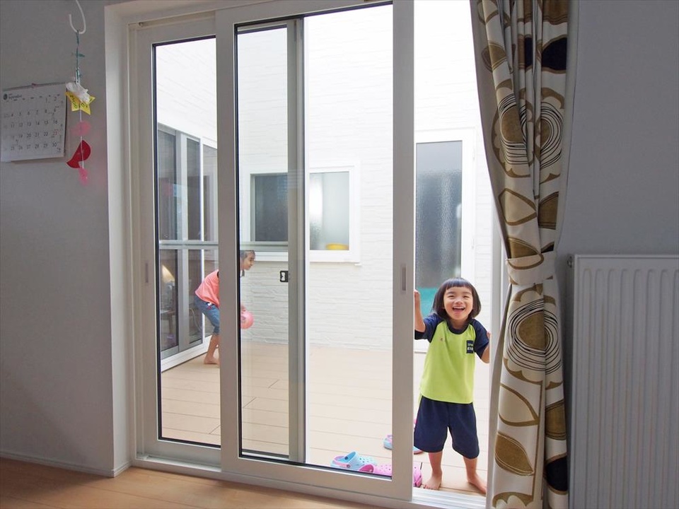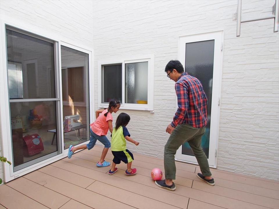 リビングから出入りできる中庭のある住宅なら、家に居ながら気軽にアウトドアを楽しむことができます。こんな風に家族だけで思い切りボール遊びができるミニパークにも変身!近くに公園が無い、まだ子供だけで遊びに行かせるのは心配といった小さなお子さんでも、ママの視線が届くから安心です。