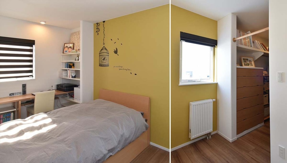 札幌市Nさんのお宅はご夫婦と3人のお子さんの5人家族。子供のプレイスペースとして使っているリビング横の部屋は、奥さまがプリザーブドフラワーの教室にも使う予定で、用途に合わせて部屋を使い分けられるフレキシブルな造りです。ご主人は、主寝室に書斎コーナーと「懸垂棒」を希望。懸垂棒は空間をうまく活用し、ウォークインクローゼットの間口に設置しました。