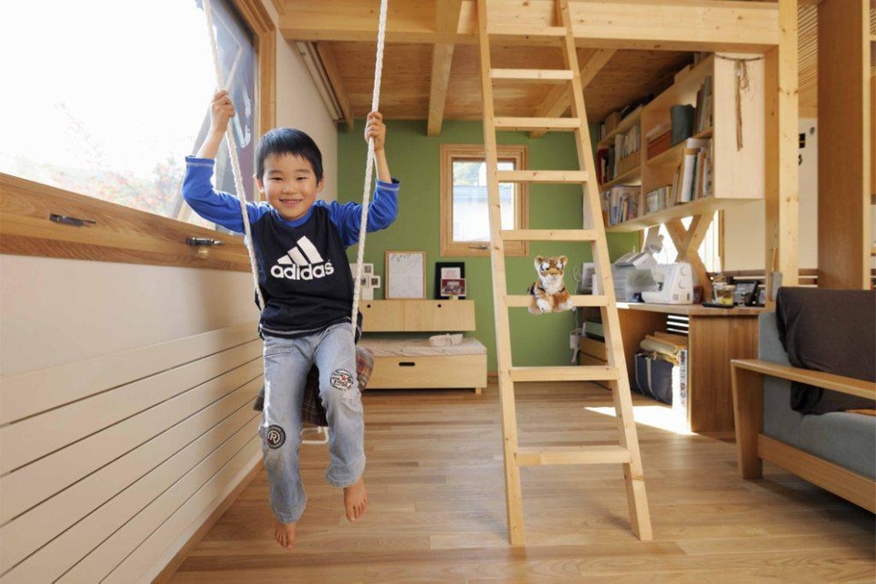 リビングにロフトがあると、梯子の上り下りだけでも良い運動になりそうです。ブランコもあれば、子供は大喜びですね。