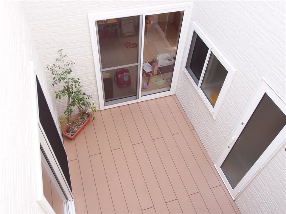 「うちの中庭が、本当に大活躍しています」と、うれしそうに話す奥さま。「夏は、子どもたちをビニールプールで遊ばせたりしています。1階はリビング、和室、ユーティリティーと三つの方向に出入り口があるので、プールからすぐバスルームに直行してシャワーも浴びられるんですよ」。