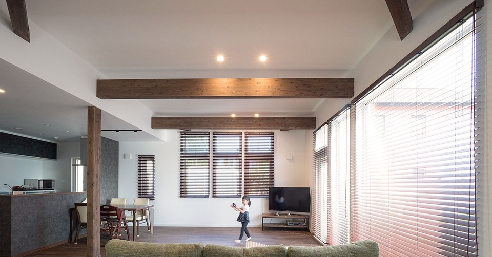 リビングの天井は現しの梁よりも高い位置にあり、ダウンライトが梁や天然木の床をムーディーに照らし出します。床材には道産のカバ材を使用していて、お子さまのはだしの足にも心地よい感触です。