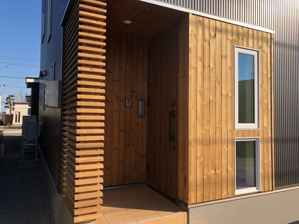 玄関まわりは木の質感が好印象です。家の中にお邪魔する前に、ちょっと気になるものが建物の右側にありました。