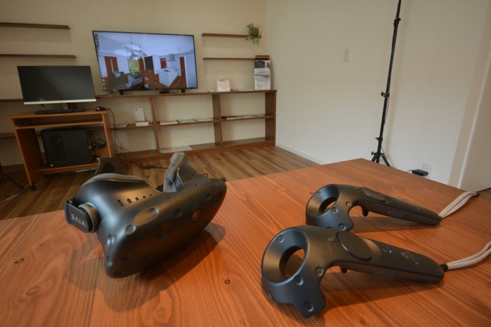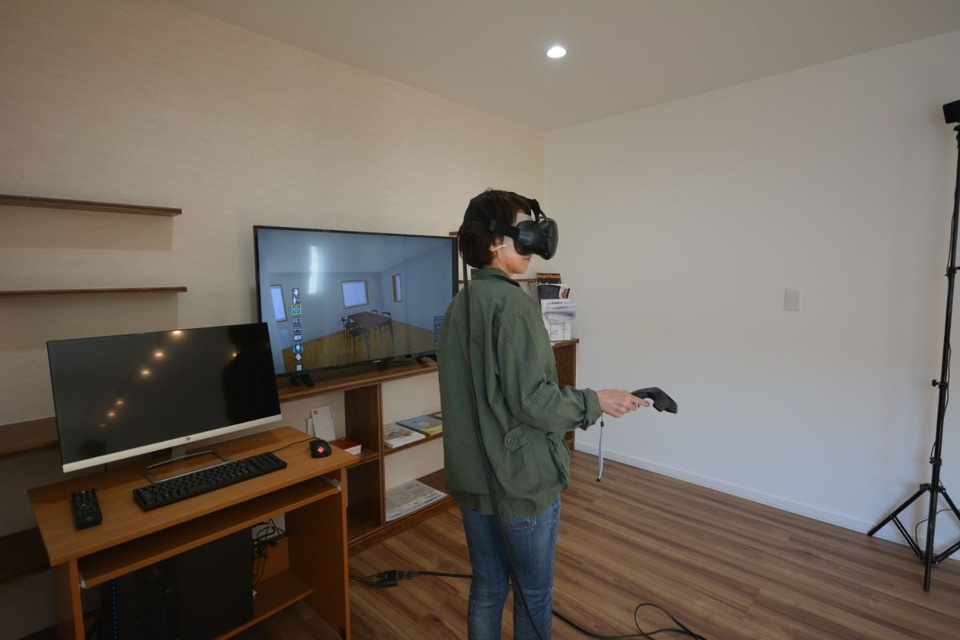 しかも、このモデルハウスにはVRが設置されていて、間仕切りや造作をプラン上で加えた場合、あるいは室内の壁紙の色を変更した場合などに、どんな空間になるのか、バーチャルリアリティ空間で体験することができます。