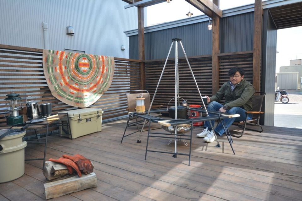 渋谷社長がコーヒーを飲みながら寛いでいます。タープを開ければ空を眺められます。