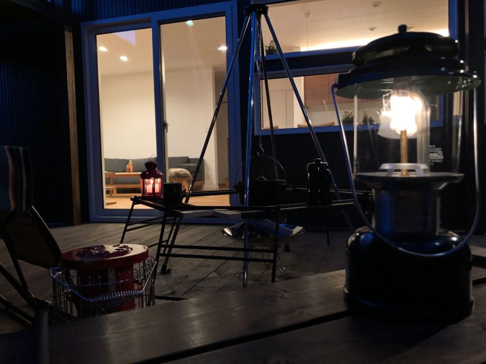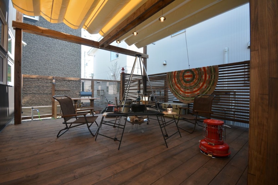 こんなに広いので洗濯物を干したりするだけじゃ使いきれません。自宅の庭で気軽にキャンプ、アウトドアを楽しむ「ベランピング」を楽しみませんか?という提案なんです。ベランダとグランピングを合わせた造語です。タープを閉じれば夏でも涼しい空間になります。屋外にあるもう一つのリビング・ダイニングとして活用できます。