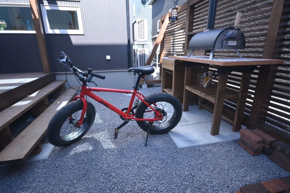 ピザ窯、ファットバイク…。庭が趣味の空間になりますね。