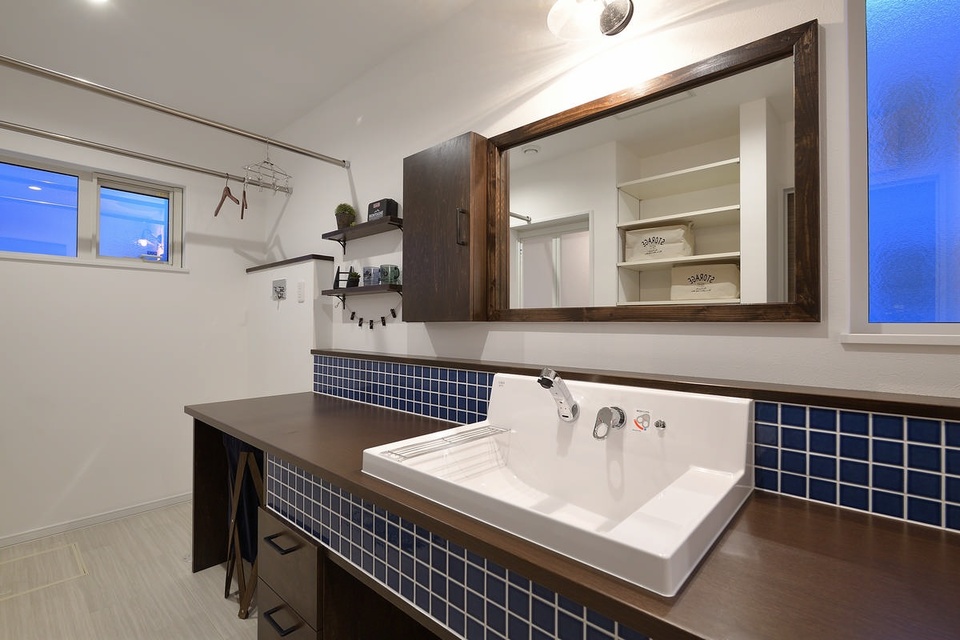 vita+の見どころ、まずはこちら。目が覚めるようなコバルトブルーのタイルラインが美しい、清涼感あふれる大きな洗面化粧台です。キッチンの隣にあり、自由に行き来できるので便利。 幅260センチもある洗面カウンターは、一般的なシステムキッチンとほぼ同じ大きさ。身支度で忙しい朝でも、家族全員が横並びできるほどの贅沢すぎるスペースです。