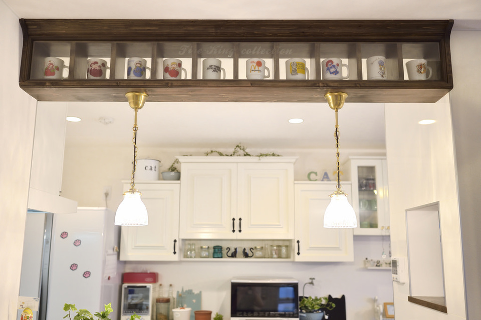 また、対面キッチンの上には奥さまがコレクションしているファイヤーキングのマグカップが飾られています。