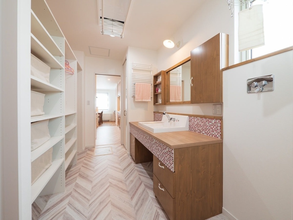 広々としたユーティリティは、担当者である石井さんのこだわりが一番詰まったスペース。モザイクタイルをあしらった洗面台は大人2人が優に並んで使える180㎝幅。天板は普通の木の板に見えますが、実は水に強く、お手入れしやすい木目調のメラミンを使用しています。タオルのちょっと置きだけでなく、服を畳んだり、アイロン掛けも出来る天板は作業台としての役割も果たします。そしてひと際目を引くのが、壁一面に造られた大収納。小さな子どもの洋服全般と、大人の下着や靴下、仕事用のスーツやYシャツなどを収めるイメージなのだそう。