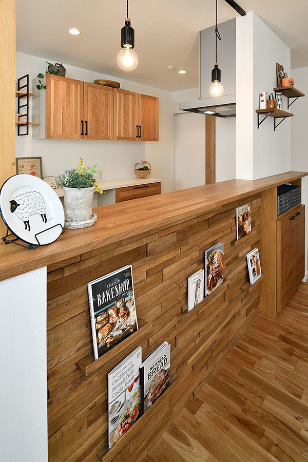 「アルテプラスの見どころのひとつは、キッチンカウンターに張られた個性的な羽目板です。ひとつずつ当社の大工が丹念に積み上げました。木の組み方ひとつで表情がガラリと変わるんですよ」と斎藤さん。