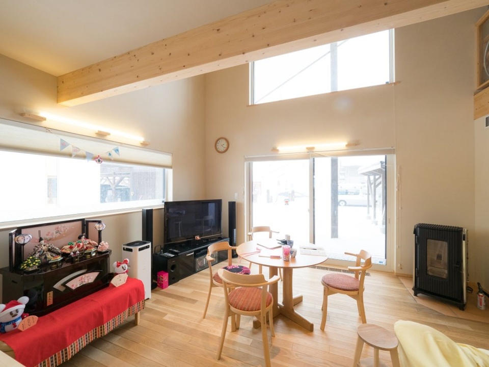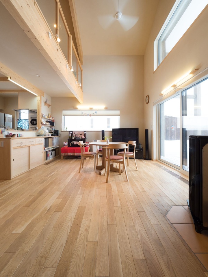1階のダイニングです。吹き抜け空間で、大きな窓から明るい光が差し込んでいます。-20℃を切ることもある寒さ厳しい旭川圏では、住宅の暖房費も他の地域より多くかかります。