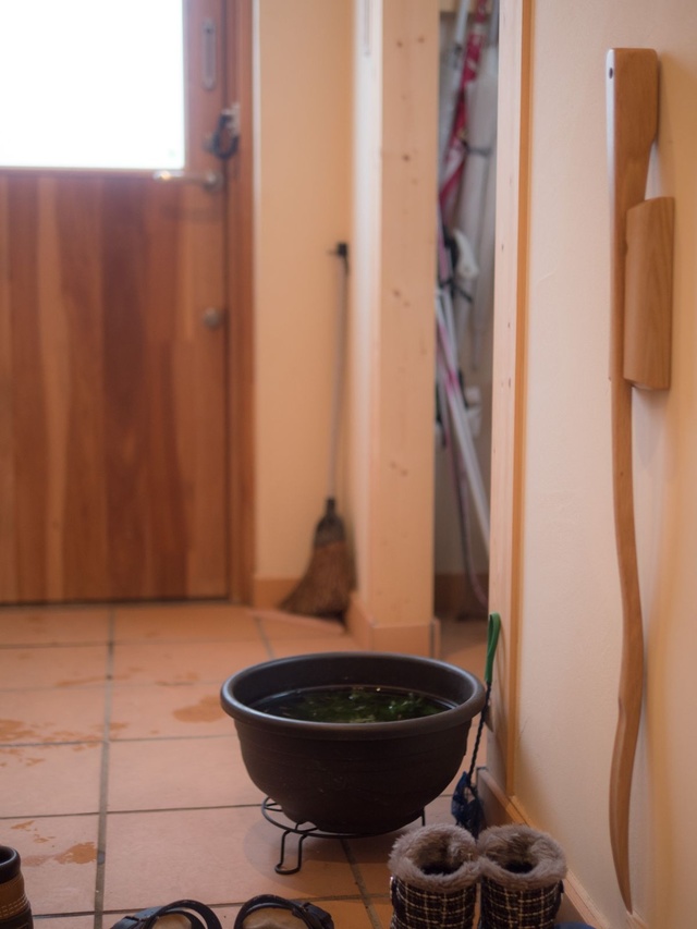 テラコッタタイルの玄関土間の上には、25℃前後が生育適温ともいわれるメダカが鉢の中で元気に泳いでいました。