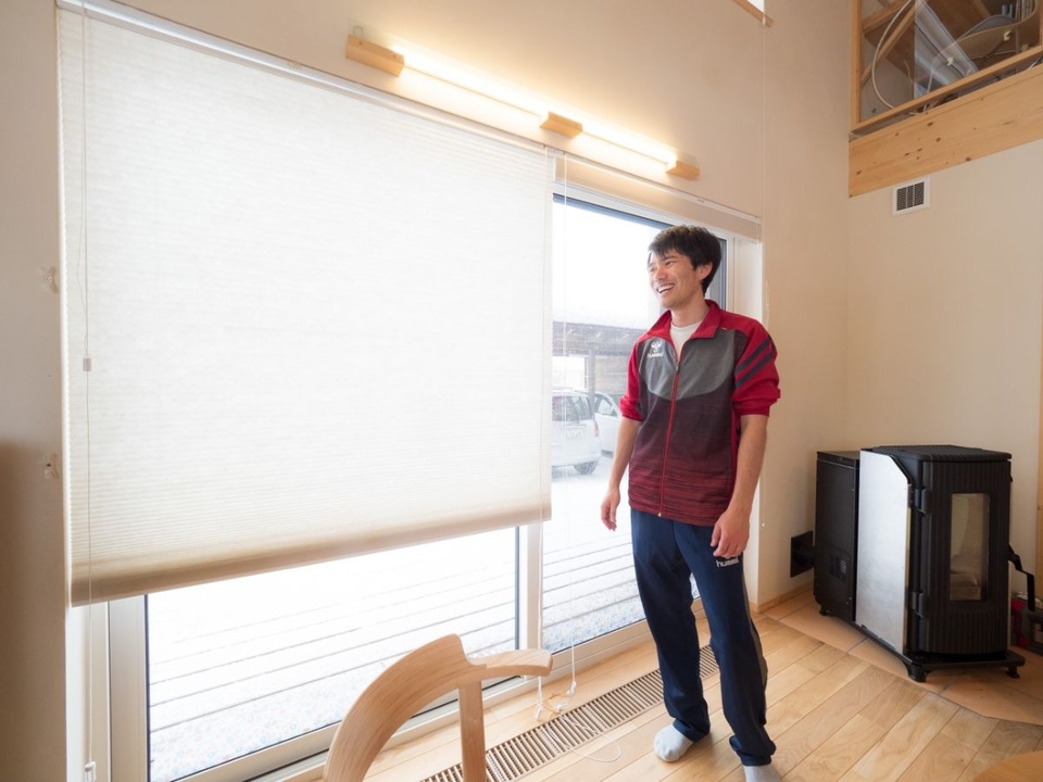 窓にはそれぞれ断熱ブラインド「ハニカムスクリーン」が設置されていて、窓際にパネルヒーターなどの暖房機を設置しなくても寒くないそうです。