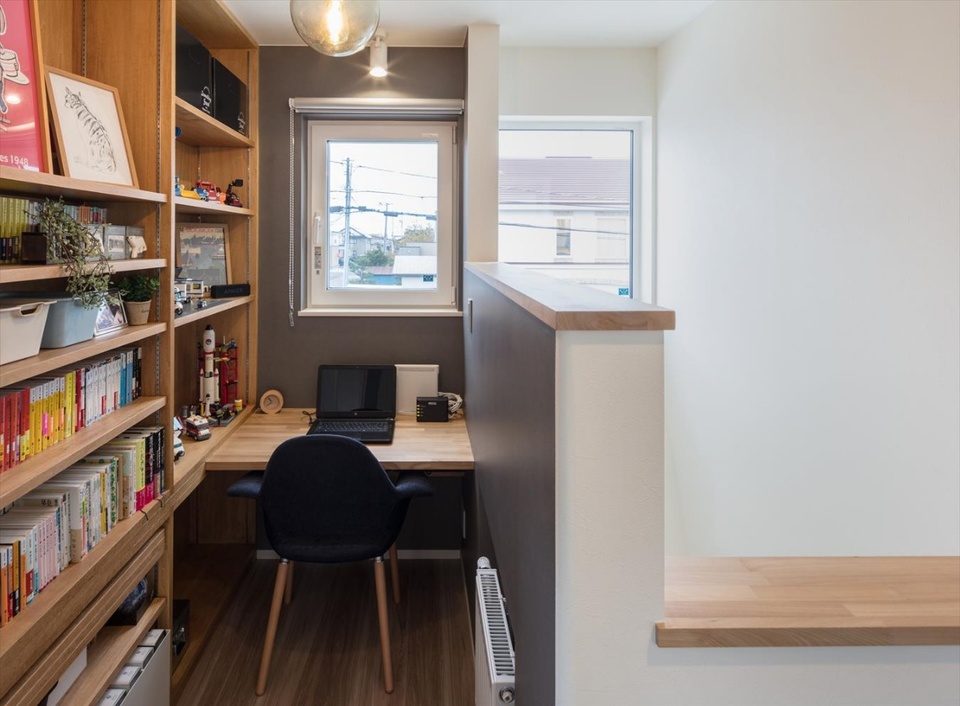 階段を上ってすぐ正面に、ご主人が希望した書斎スペースがありました。造作の大きな棚には書籍だけではなく、ご主人のお好きなコレクションが並んでいます。ひとりの時間を楽しめる隠れ家的空間で、毎日の疲れも癒されそうです。