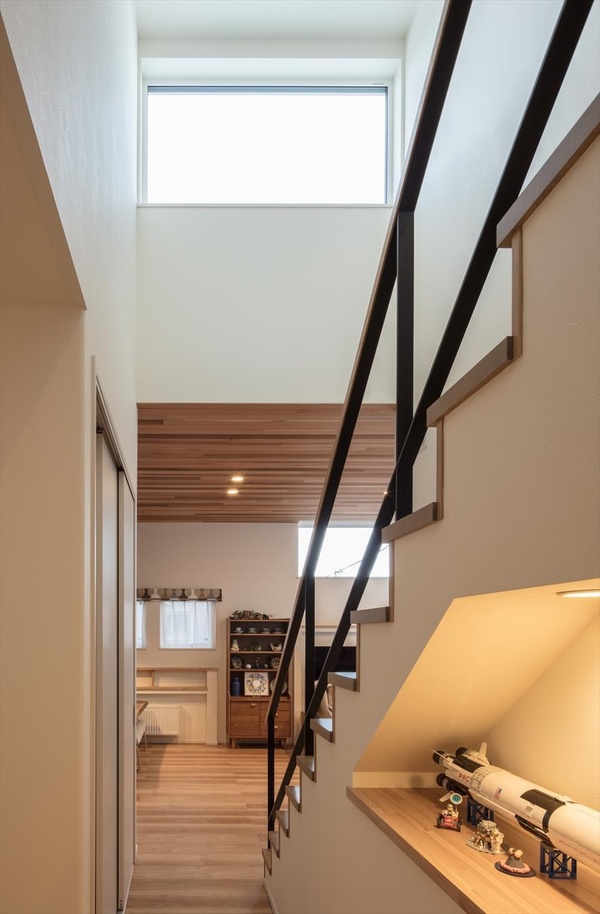 吹抜けからたっぷりと日差しが差し込む明るい廊下を抜けるとリビングです。階段下の壁には遊び心たっぷりのニッチが。息子さんもブロックのコレクションを飾ってアレンジを楽しんでいるそう。