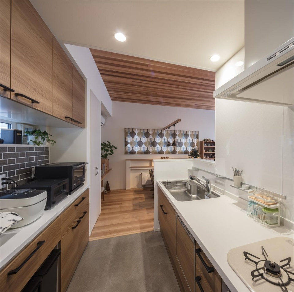 視線を気にせず作業に集中できるよう、見せる部分と見せない部分にメリハリをつけて設計されたキッチン。調理スペースはリビングから見えませんが、ちらりと見える調理台の背面には落ち着いたグレーのタイルがお洒落。ご家族の気配がほどよく感じられる、お料理好きな奥さまに嬉しいつくりです。ご主人もコーヒーを淹れるのが得意で、よくご家族やご友人に振る舞うそう。ご夫婦でキッチンに立つ時間が増えたとは羨ましい限りです。