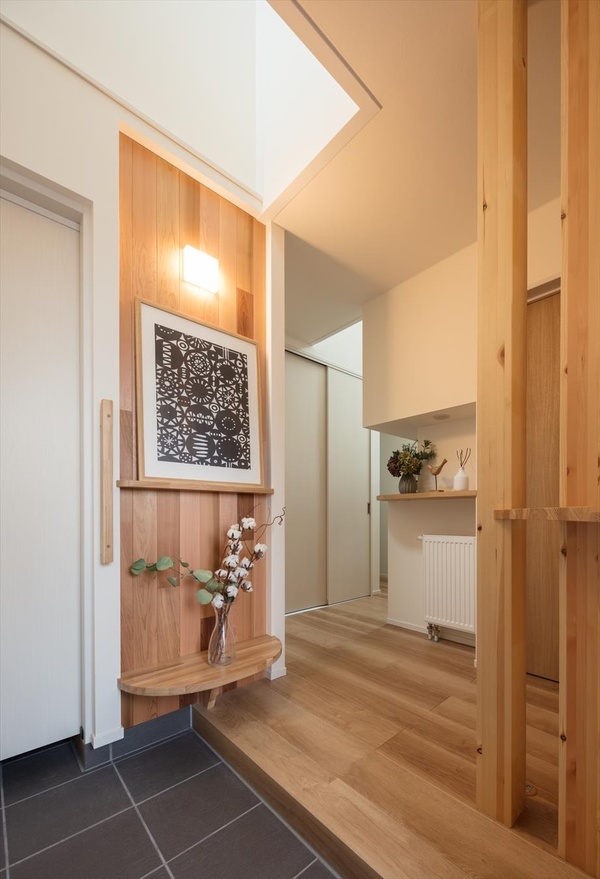 玄関を入ると、正面には扉付きの大型ウォークインシューズクローゼットが。ご家族の衣類や靴・小物などはすべてまとめて収納。その横にはベンチとしても使える飾り棚。土間には床暖房が施工され、ビルトインガレージと直結する出入り口もあります。北海道の寒い冬でも快適に使えるのが嬉しいですね。