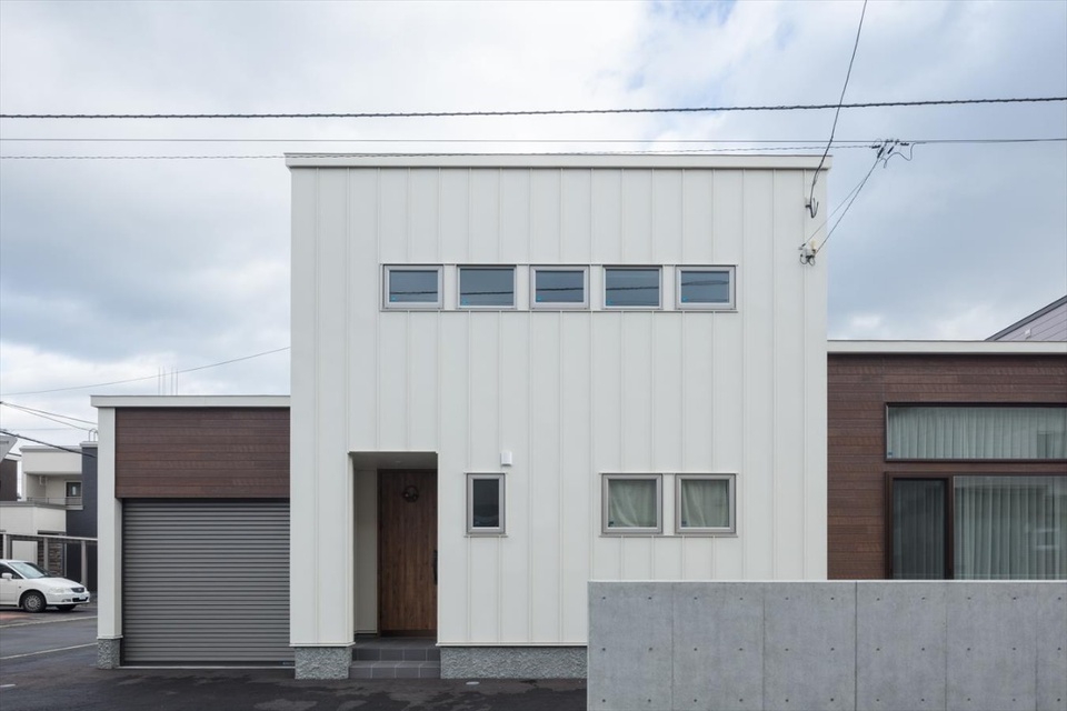 四角いフォルムに窓が少ないシンプルでスタイリッシュな外観。オフホワイトとブラウンが基調の落ち着いた雰囲気が住宅街に自然に溶け込んでいます。見た目の良さはもちろん、雪の多い札幌で重宝するビルトインガレージは、ご主人の一番の希望だったそうです。