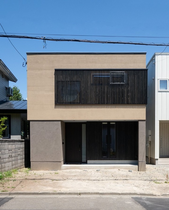 外観は京都の町家を連想させるようなモダンな造り。弾性塗り仕上げの外壁は2階が刷毛引き、1階はうずまきと凝った仕上げで、格子に見立てたルーバーはバルコニーの目隠しにもなっています。