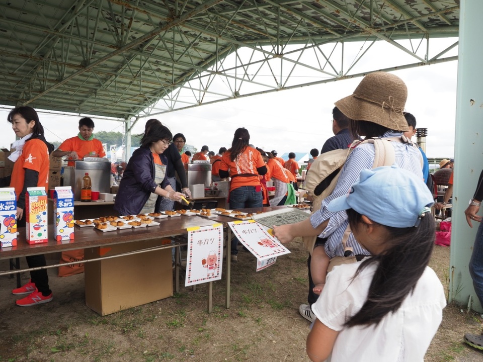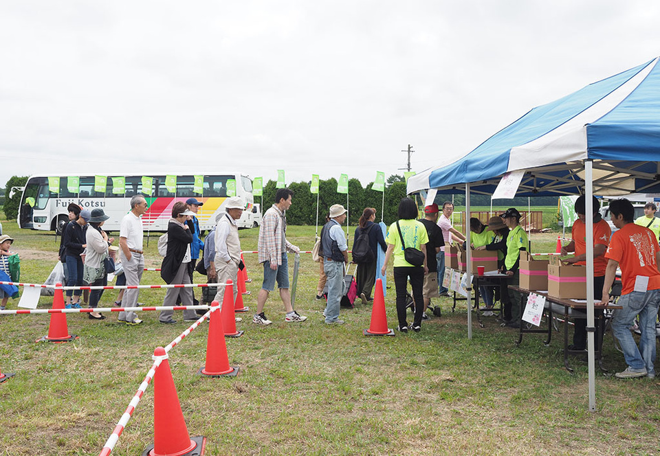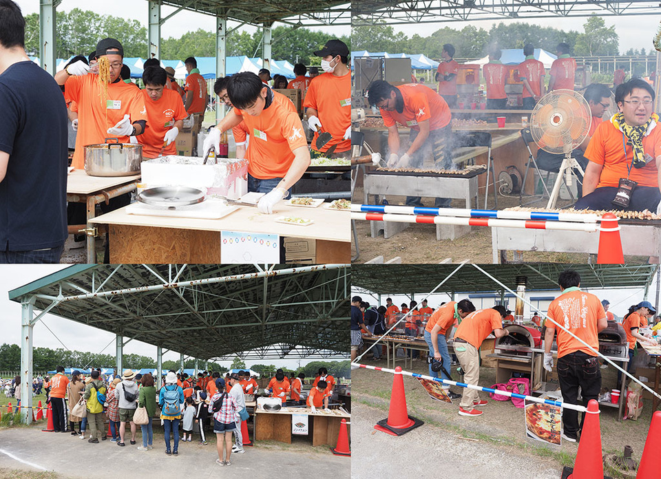 会場内では朝8時半からオレンジのTシャツに身を包んだ恵風会メンバーによって屋台の準備が進められています。長い行列が出来ているのは人気の窯焼きピザ。今年は3台をフル稼働。恵風会の方たちによるピザ焼きの作業が続きます。