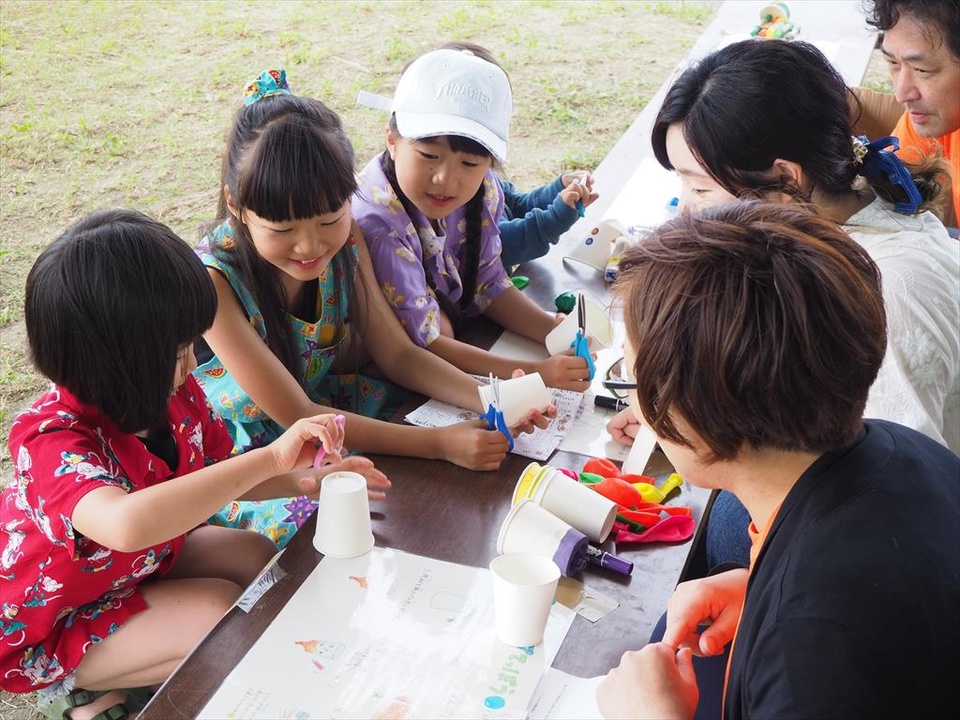 「子供コーナーでは早速ちびっ子たちがおもちゃ作りに挑戦中。中身が飛び出す紙コップ鉄砲やロケットなど、いろんなおもちゃの工作が楽しめます。