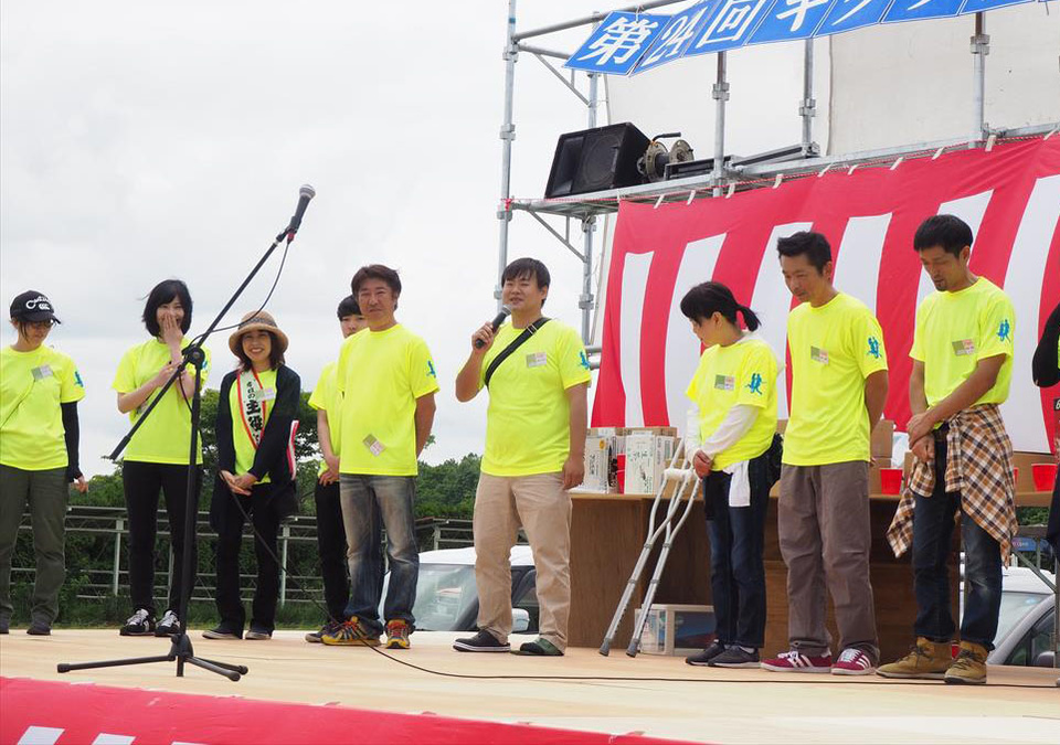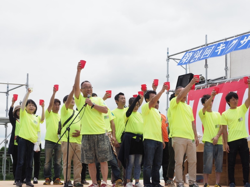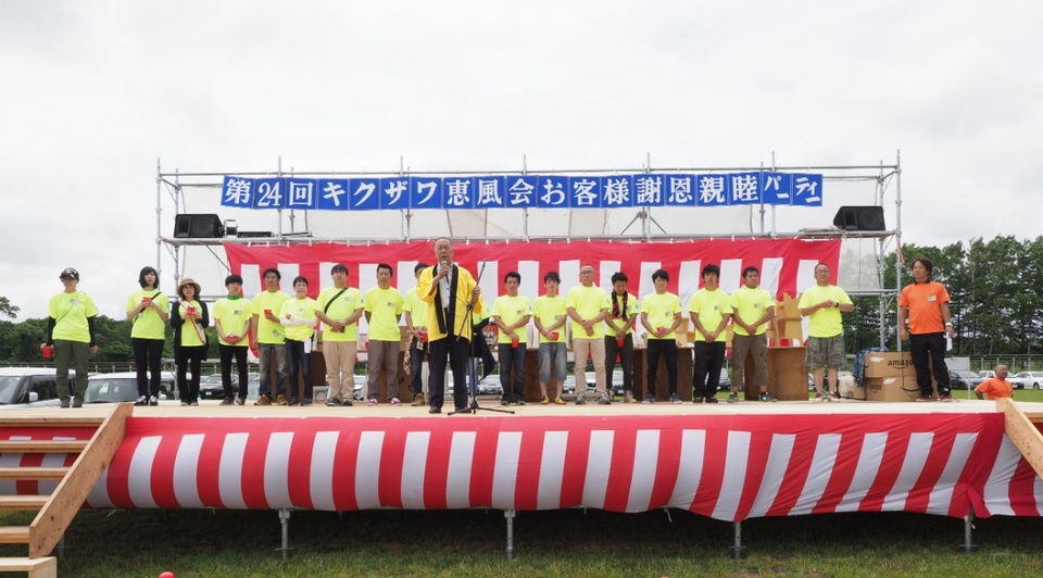 スタッフが一人ずつマイクを握ってご挨拶。キクザワ祭の中心的メンバー、菊澤章太郎さんもマイクを握ります。昨年までは社長が中心となって企画・運営してきたOB会ですが、今年からスタッフ数人が中心となって準備を重ね、この日を迎えました。