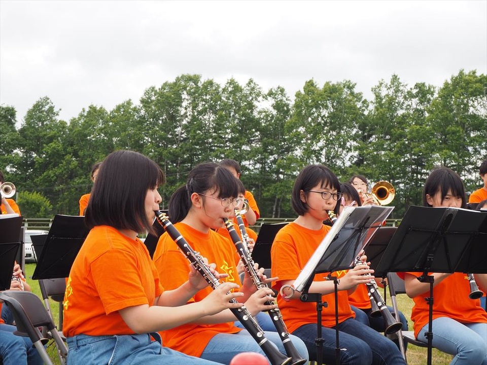 実演ショーの後は恵明中学校吹奏楽部による演奏が始まりました。広々とした芝生に高い空、緑の木々をバックに迫力ある管弦楽の音色が響き渡ります。