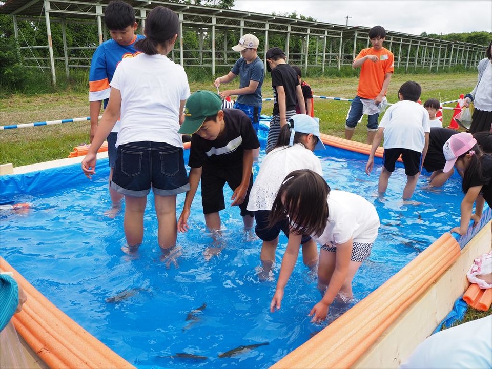 開会と同時に魚つかみ取りが始まります。小学生以下が参加でき、巨大プールの中にはニジマス・ヤマメ・銀鮭が泳いでいます。素早い動きに付いていけるかな?
