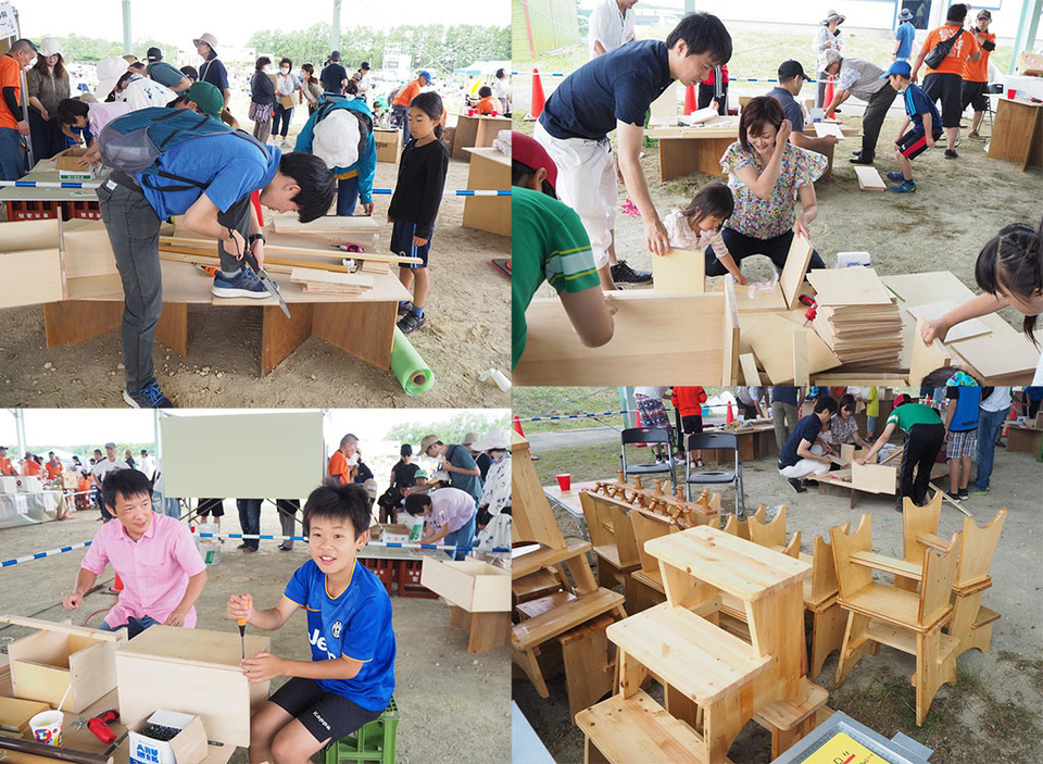 DIYコーナーでは端材を使ってDIYを楽しむ親子連れの姿が。BOXやベンチを作っている親子も居ました。即売コーナーでは大工さんお手製の踏み台やベンチを販売しています。