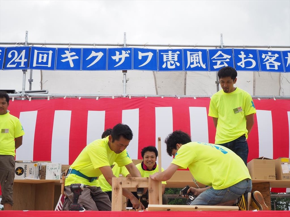 ステージ最初の演目は大工さんと板金屋さんの実演ショー。匠の技によって椅子やゴミ箱が仕上がっていく様子に目が離せません。