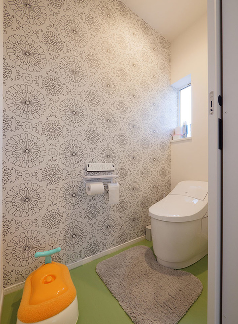 お気に入りというトイレのデザインクロスは、数十枚の中からご夫妻が検討を重ねたもの。「クロス一枚にしても、常にふたりで決めていました。現場で白田さんとやり取りするときも、娘が小さいので自宅にいる妻と、スマホのマイクを通じて3人で話し合っていたんですよ」と松口さん。