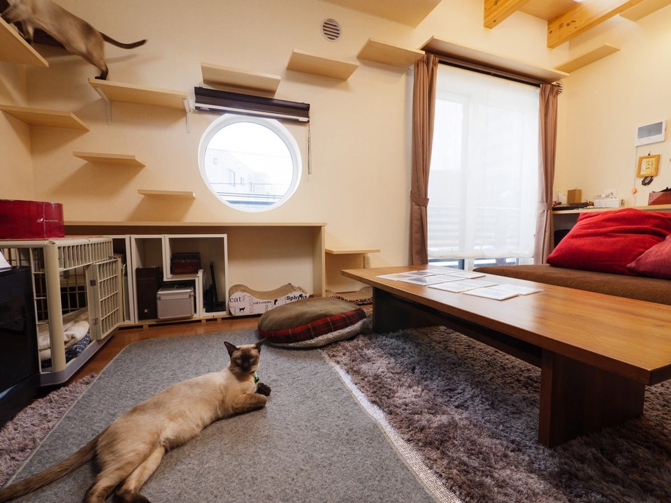ほかにも、ネコ砂が散らばらないように床を低くくりぬいたトイレスペースや、幅20センチほどのネコ専用バルコニー、爪で引っ掻いても傷が目立たない凹凸のあるクロスなど、ネコと一緒に暮らす工夫がいっぱい。 カーテンも裾だけ上げてネコの視界を邪魔しないシェードタイプを選択するなど、とことん「ネコ目線」を追求した、こだわりぶりでした。