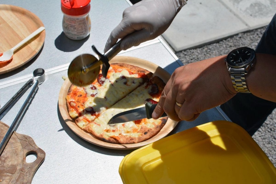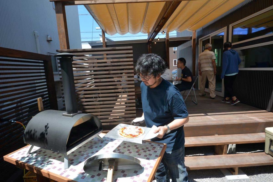 ピザを、ウッドデッキで食べる皆さん。実はこのピザ。