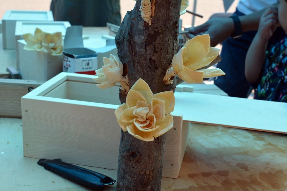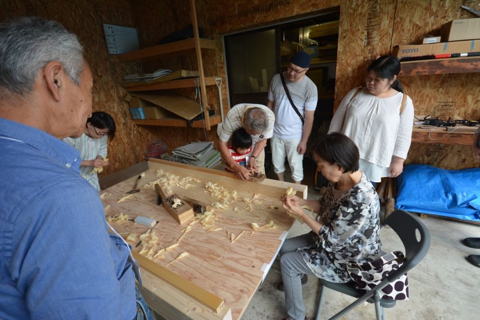 削ったカンナくずを使って何やら大工さんが参加者に教えています。
